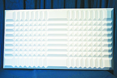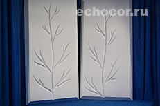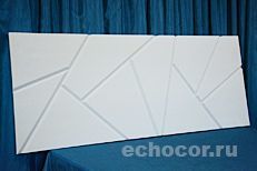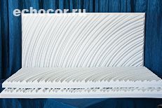 По желанию заказчика располагающиеся на одной плоскости акустические панели ЭхоКор могут быть декорированы общим рельефом. При этом группа панелей объединяется единым дизайнерским замыслом, рисунок переходит от одной панели к другой, образуя связанную композицию из множества деталей. Каждая панель нумеруется на производстве и монтируется на объекте в соответствии со схемой укладки.