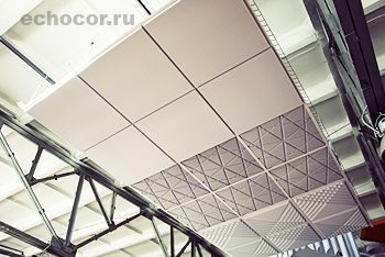Подобная форма звукопоглощающих панелей ЭхоКор позволяет не только создать ровную плоскость потолка, но и с запасом предупреждает последствия расширения панелей при возможном увеличении влажности воздуха. При этом в помещение вносится необходимое количество звукопоглощающего материала.