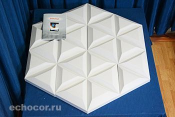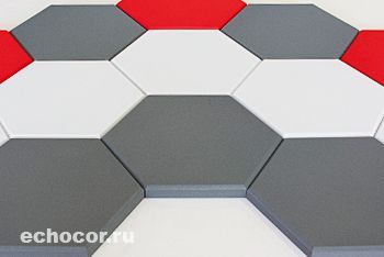 Акустическими панелями ЭхоКор «Шестигранники» оформляют большую площадь стен и потолков. Панели в форме шестигранников применяются так же, как и другие плоские панели ЭхоКор, монтируются на стены и потолки с помощью клея.