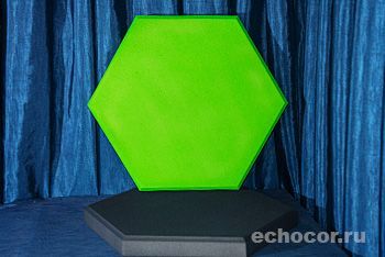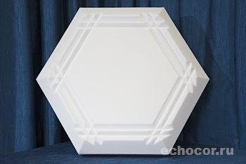 Шестигранник — более интересная, чем прямоугольник, геометрическая фигура. В ассортимент продукции ЭхоКор включены акустические панели «Шестигранники» различной толщины, начиная с 30 мм. В базовой поставке эти изделия имеют диаметр описанной окружности 560 мм и фаску по периметру лицевой стороны.