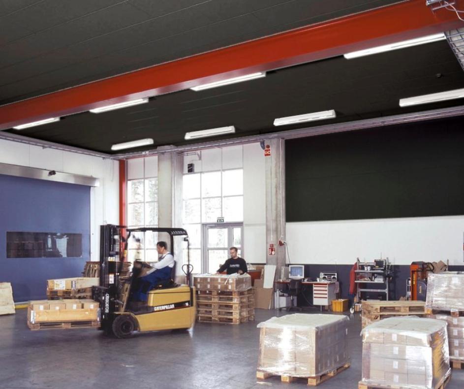 Система Ecophon Индастри А разработана для улучшения акустики в промышленных зонах, эффективно снижая шум. Панели имеют стекловолоконную основу: лицевая сторона покрыта окрашенным стеклохолстом, а задняя — неокрашенным. Стандартные кромки остаются неокрашенными, что упрощает установку.