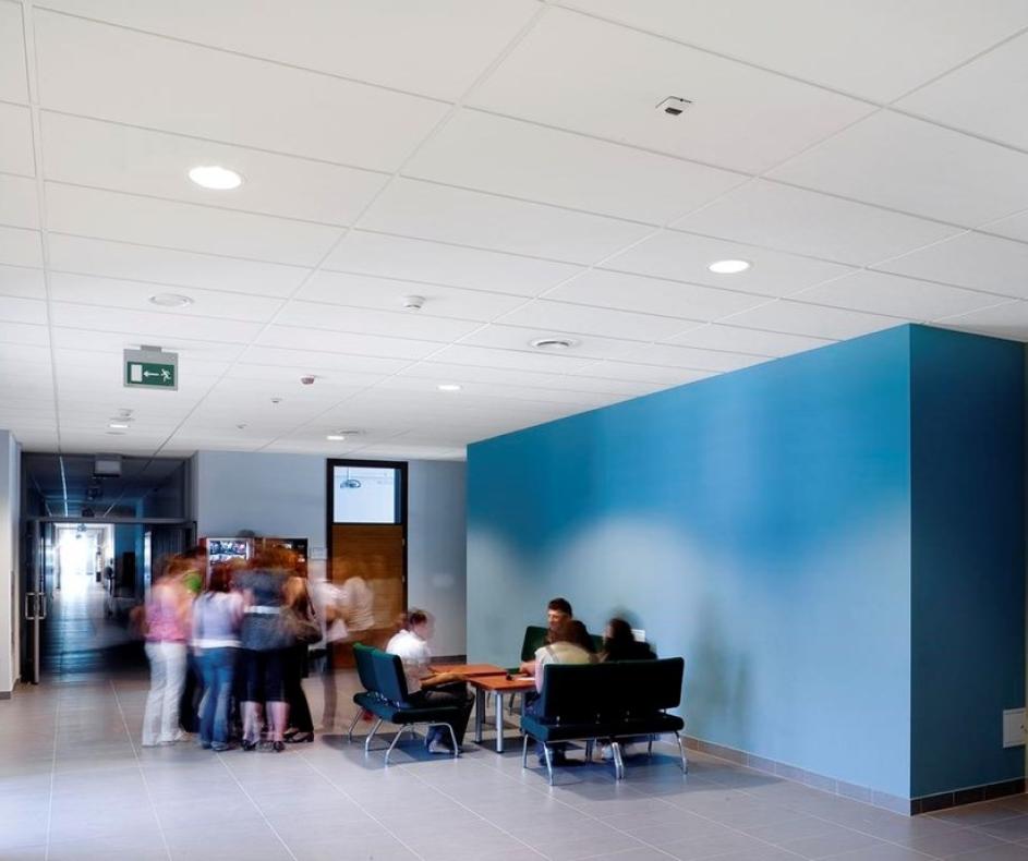 Потолочная система Ecophon Мастер E представляет собой подвесную конструкцию с утопленными панелями и черепицеобразными кромками. Такой дизайн создает теневой эффект, который подчеркивает каждую панель и частично скрывает подвесную систему. Эта потолочная система идеально подходит для открытых офисов и помещений с высокими требованиями к акустике.