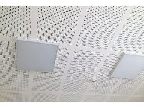 Плиты ППГЗ, перфорация «Пойнт». Смонтированные на каркасе или на стандартной подвесной системе, являются эффективными звукопоглощающими конструкциями резонансного типа. Существенное значение для величины низкочастотного звукопоглощения имеет величина относа плит от жесткой поверхности. Увеличение звукопоглощающих свойств в более широком частотном диапазоне обеспечивается дополнительным размещением плит типа Шуманет во внутреннем пространстве между жесткой поверхностью и облицовкой.