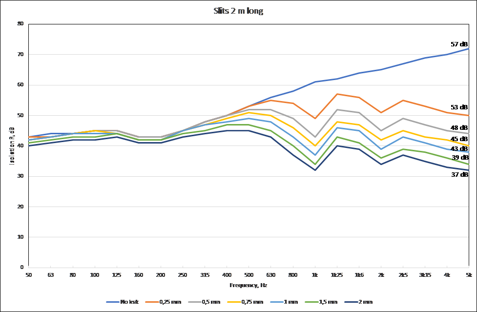 Снижение звукоизоляции для щели (разной толщины) длиной 2м.